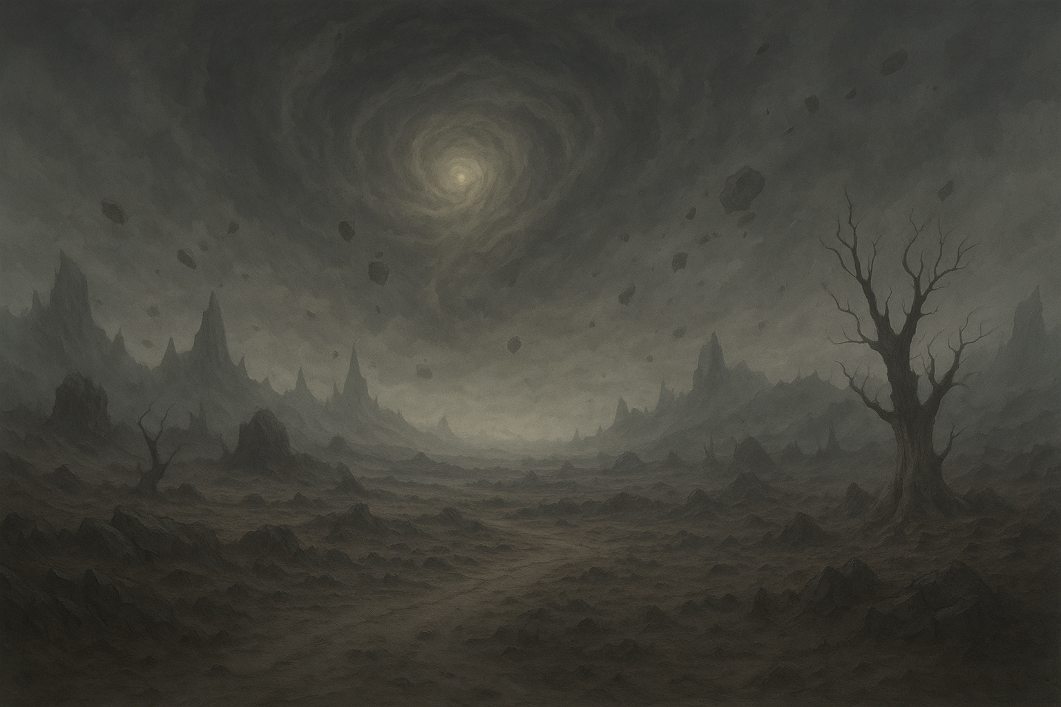 An area within the continent of Illenfar where reality itself begins to decay. At first, magical anomalies began to appear, some would distort gravity, produce flames or electrical energy, or would simply appear and disappear within a day. Over time, crops and some plant life began to fail, the soil turned grey, the leaves on the trees grew dark. The wind died and animals became silent. Then, an endless gloom and fog that would never dissipate would roll in. Large chunks of earth would rip from the ground and simply be suspended in air. Eventually, the scholars suspect - time itself slow before ceasing altogether.
