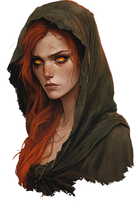 Appearance: A red haired woman with orange eyes dressed in rags, her arms appear covered in swirling flame-like tattoos.