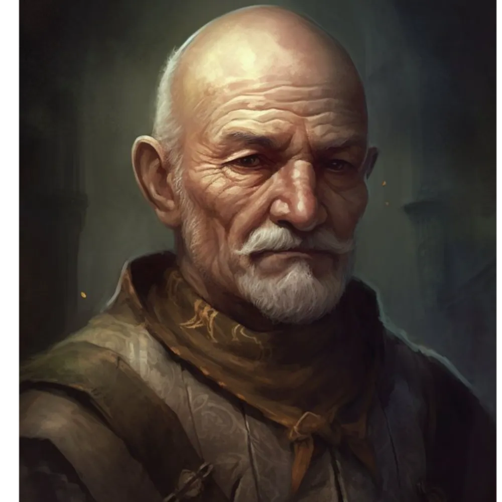 An older, weathered looking halfling man with a neatly trimmed beard, bald head and a stern expression.